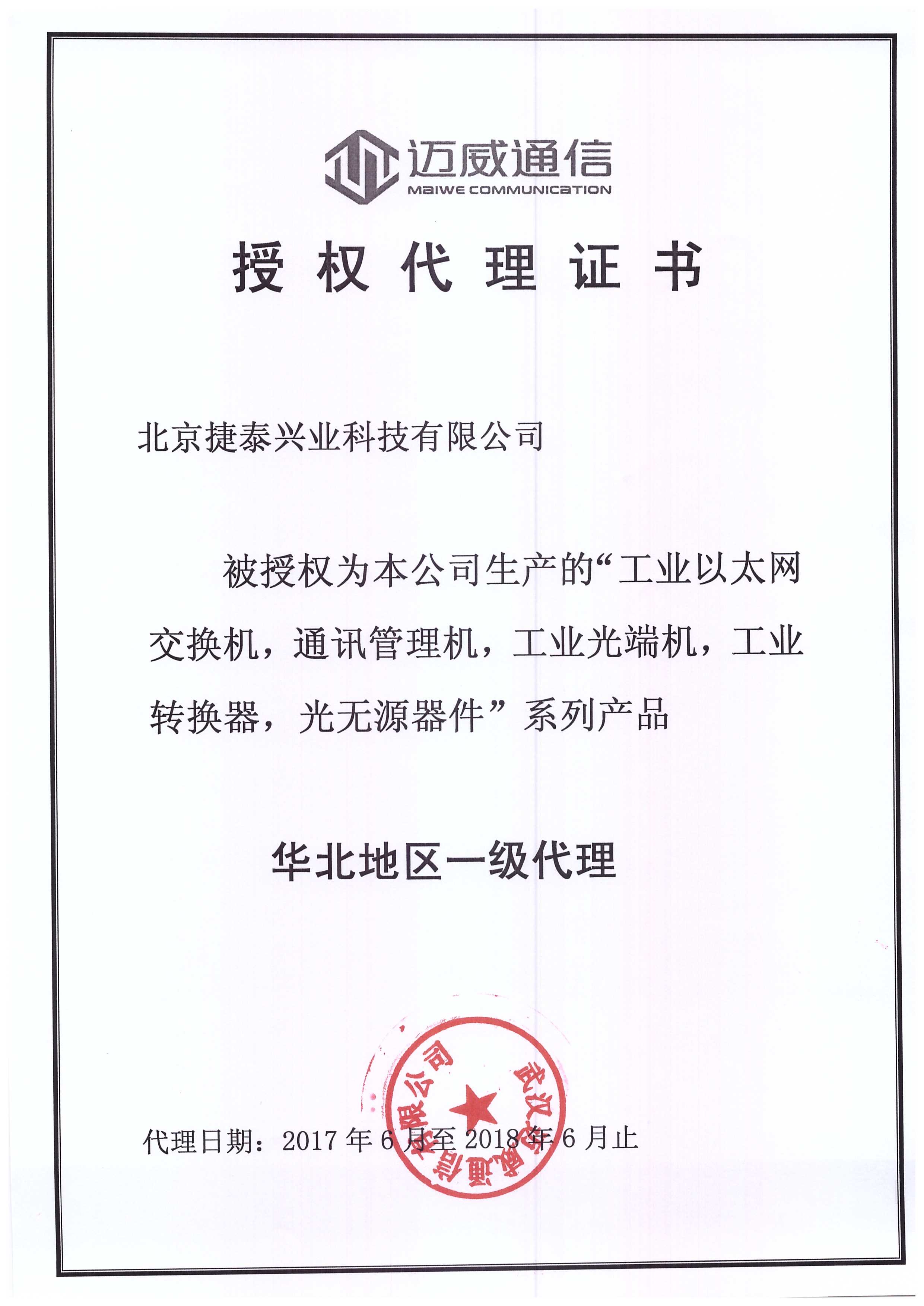 邁威工業(yè)交換機(jī)2017年代理證書