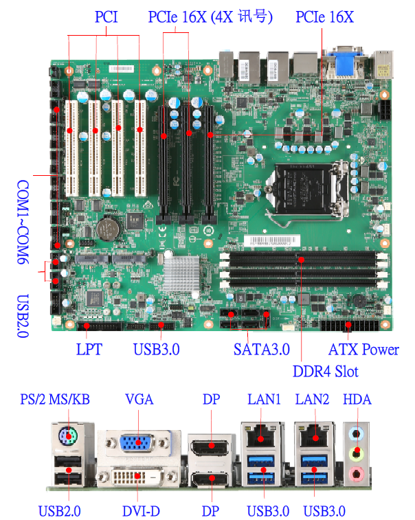 Intel H110/Q170/C236 ATX Board w/VGA/DVI-D/2DP/2GbE/6COM/12USB/HDA