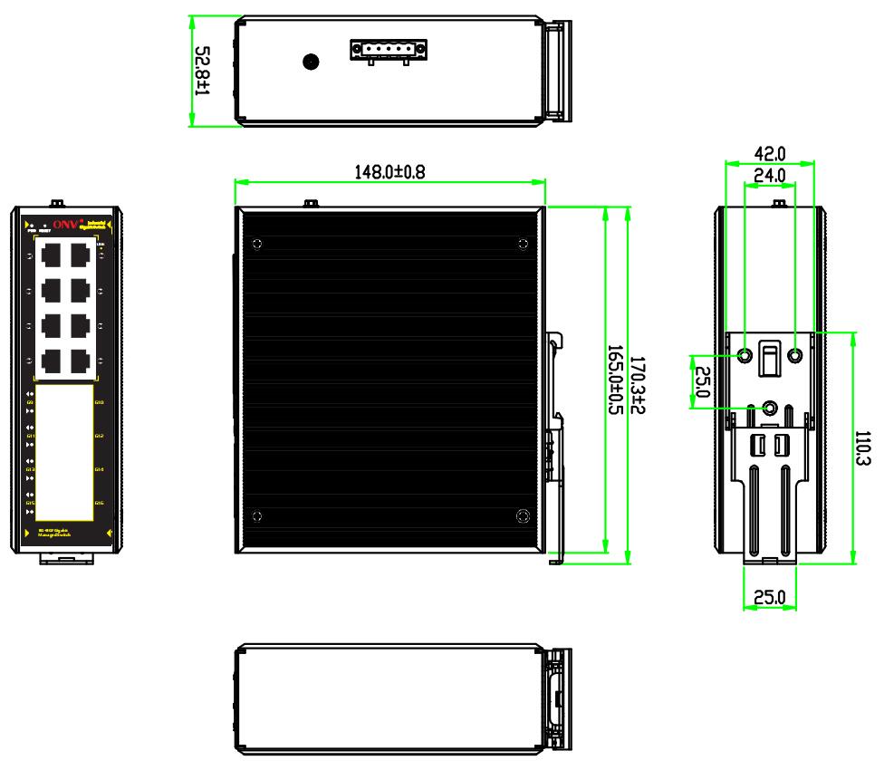 8個10/100/1000M RJ45端口+ 8個100/1000M SFP光口插槽, 2組V+,V- 冗余DC電源接口(鳳凰端子); 端口防雷:6KV 8/20us;防護等級:IP40 ,待機功耗:<8W;滿載功耗:<18W